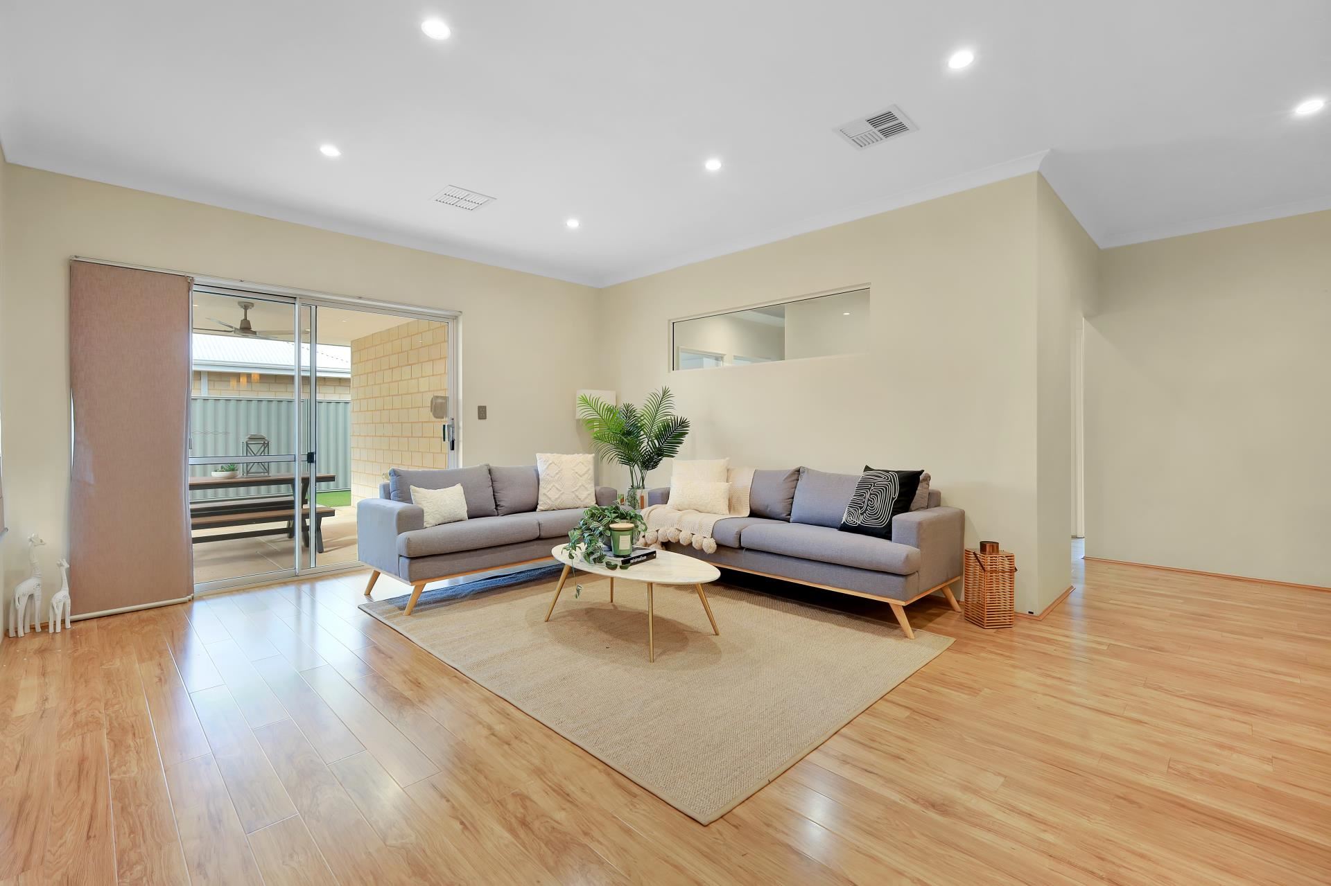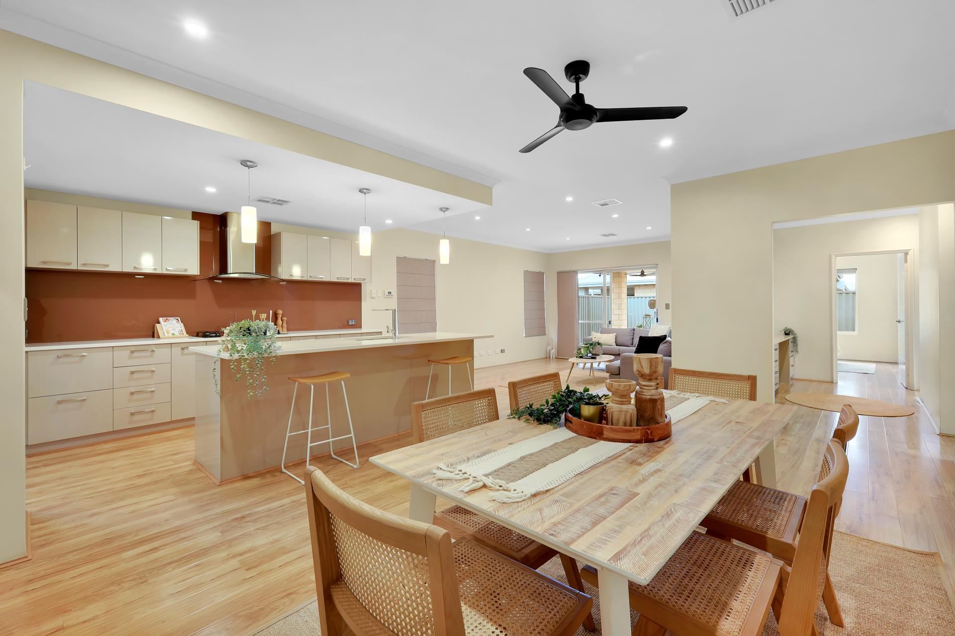 Theconceptdesigning reimagined this home to prioritize light, flow, and everyday comfort. By opening sightlines between the kitchen, dining, and living zones and using a restrained neutral palette, the design amplifies natural light and creates a relaxed, cohesive atmosphere. Warm timber flooring and soft beige walls provide a unifying backdrop while textured rugs, layered cushions, and sculptural accent pieces add tactile warmth. Key moves included repositioning the furniture to encourage conversation and circulation, specifying low-profile sofas and round coffee tables to soften the plan, and introducing a streamlined island to make the kitchen the social hub. Pendant lights above the island and recessed downlights create layered illumination, while discreet greenery and simple tabletop styling bring freshness without clutter. Materials and finishes were chosen for durability and timeless appeal: engineered timber flooring, easy-care upholstered seating, matte cabinetry surfaces, and stone-effect benchtops. The result is a versatile family space — perfect for entertaining, relaxed evenings, and everyday living — that feels modern, comfortable, and thoughtfully composed. Credits: concept & styling — theconceptdesigning.