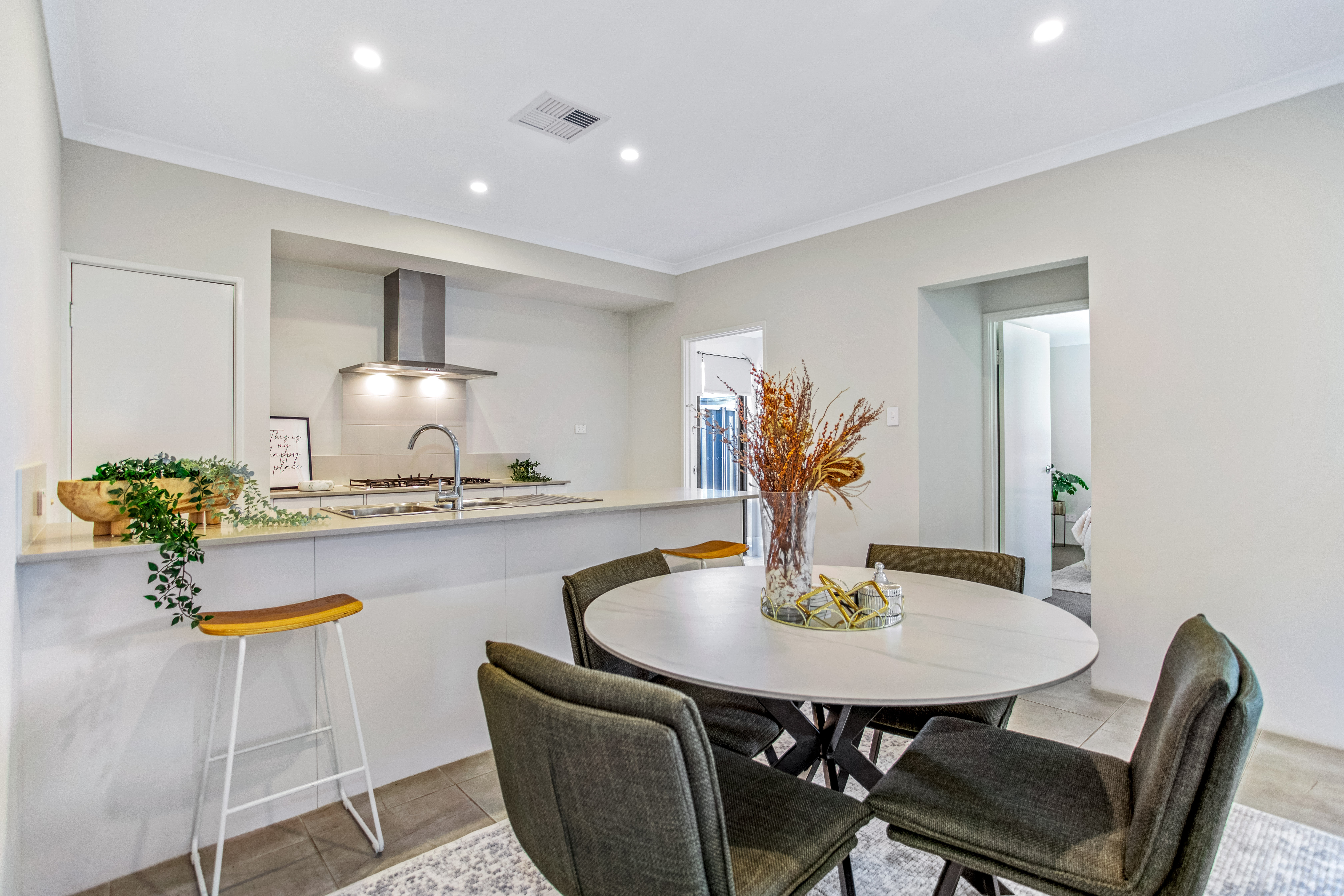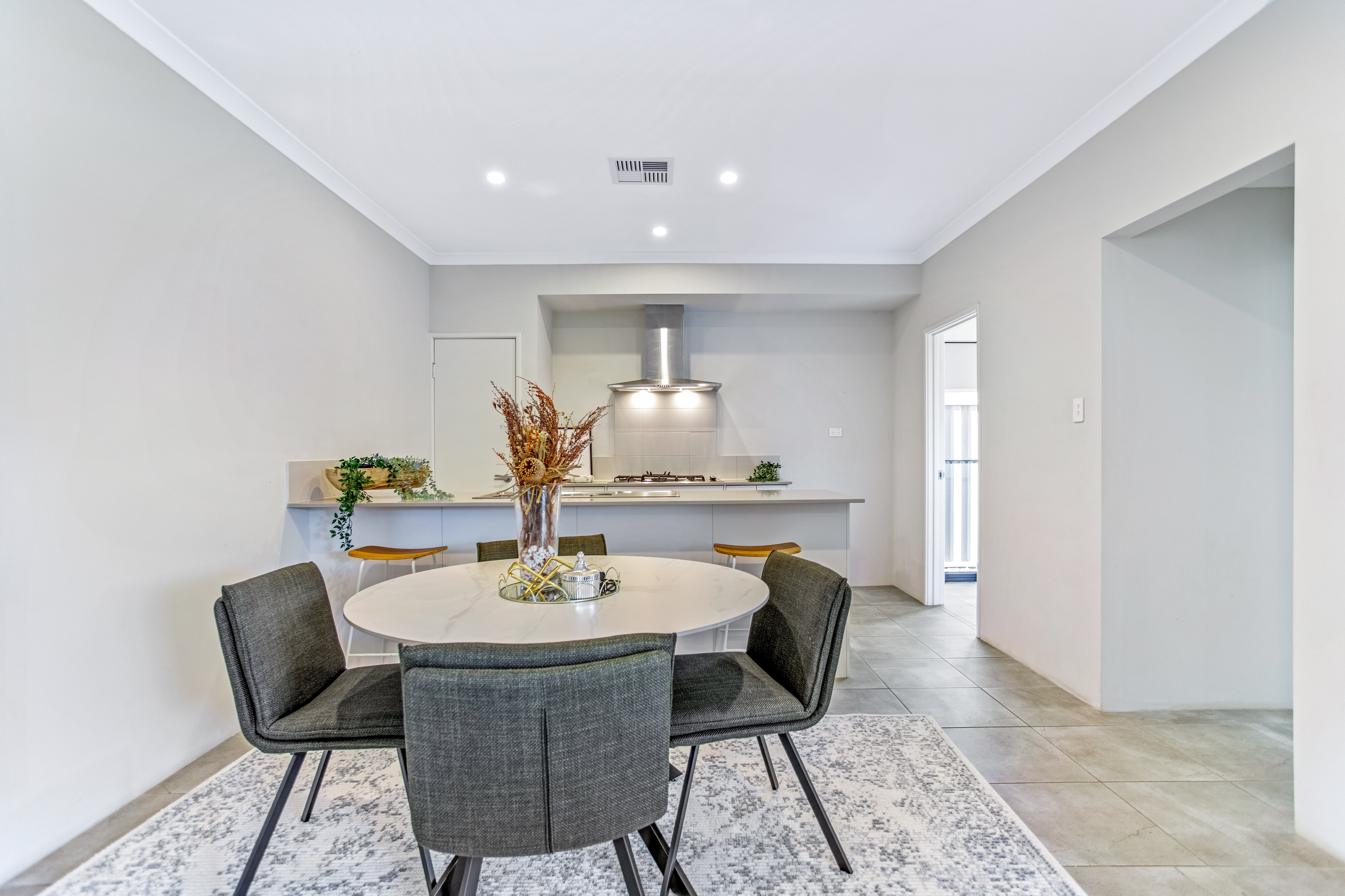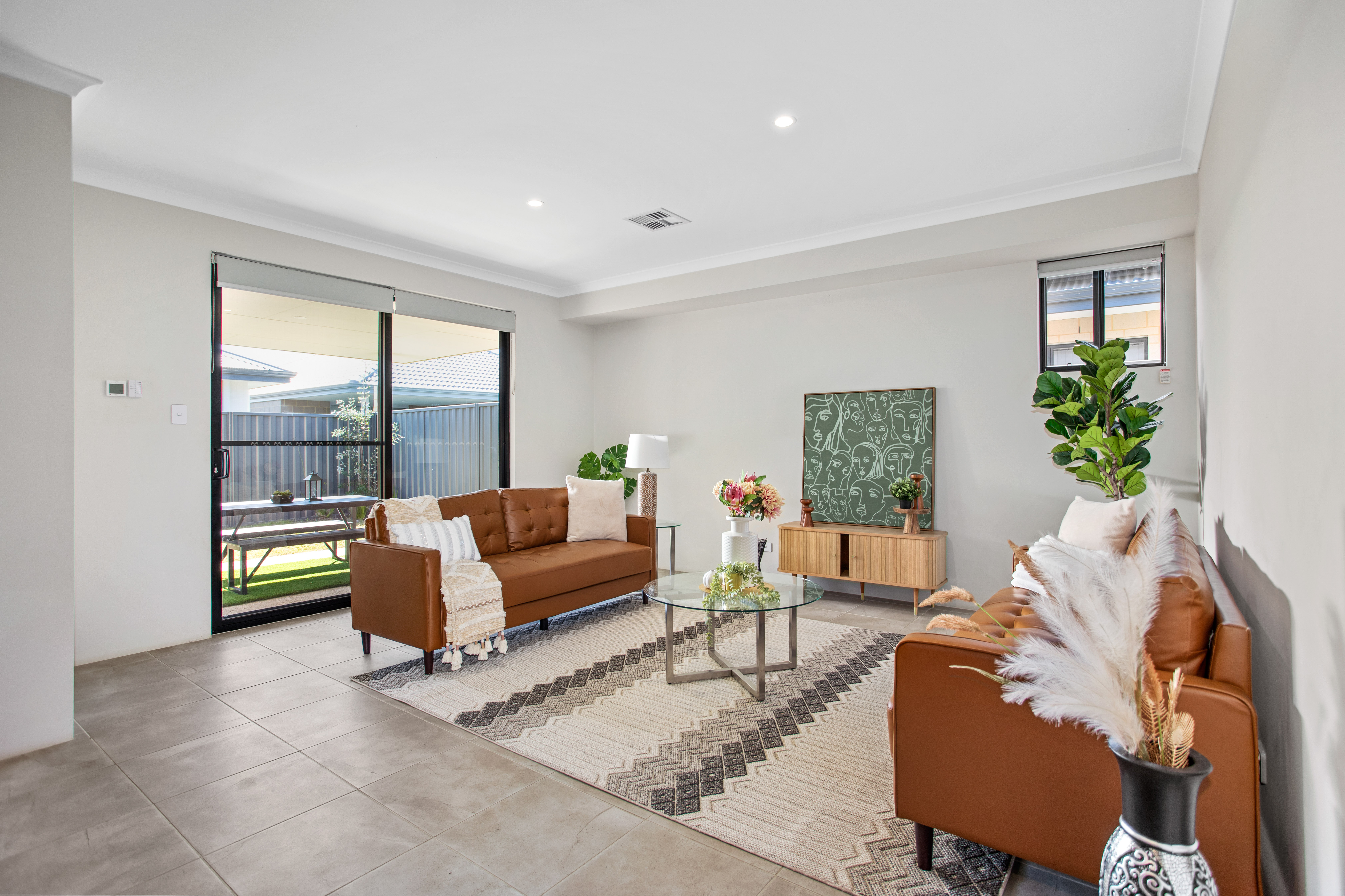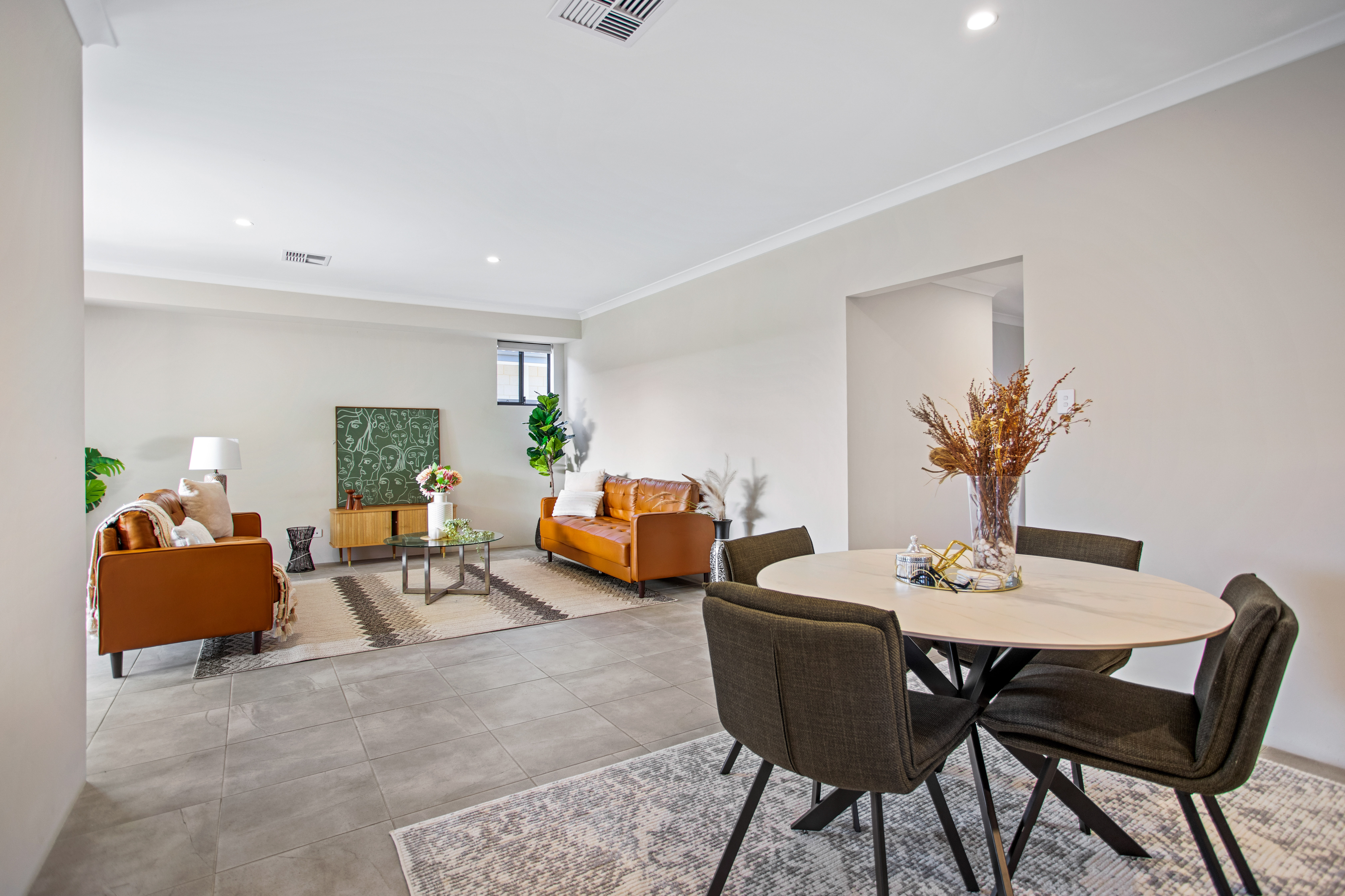 Theconceptdesigning styled this interior with a focus on balance, warmth, and functionality. The living space features rich tan leather sofas paired with a textured geometric rug and glass coffee table, striking a perfect balance between modern sophistication and comfort. Natural greenery, sculptural décor, and soft textiles elevate the aesthetic, bringing freshness and personality into the room. The open-plan kitchen and dining area continues the theme with clean lines and understated tones. A sleek breakfast bar with timber stools transitions seamlessly into the dining zone, where a round table and dark upholstered chairs encourage connection and conversation. Subtle decorative accents, such as vases with dried botanicals and styled greenery, infuse warmth without overwhelming the space. Together, these spaces embody modern family living — refined yet welcoming, stylish yet practical. The design highlights how thoughtful material selection, layered textures, and considered styling can transform everyday interiors into spaces that feel both timeless and full of character. Credits: concept & styling — Theconceptdesigning.