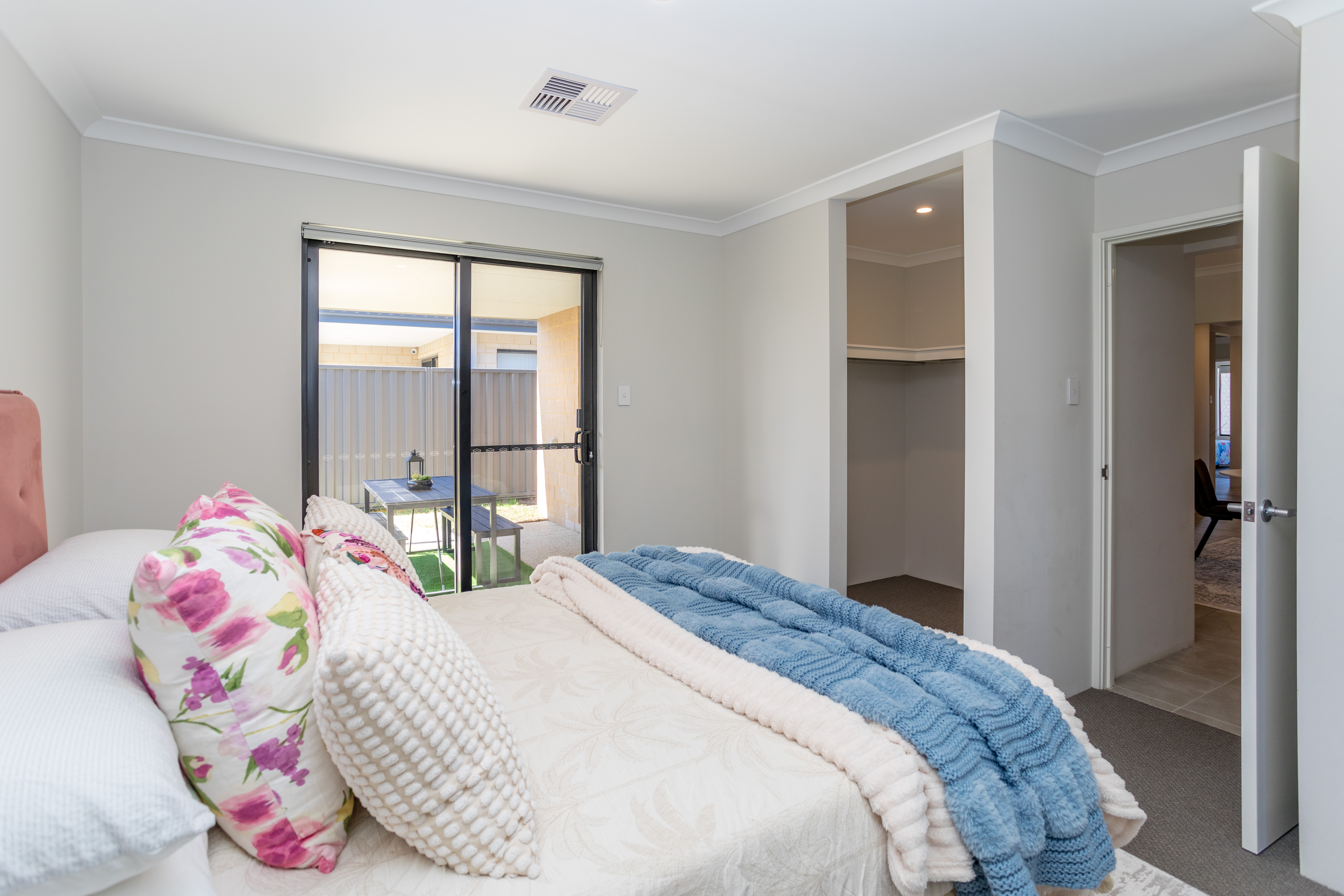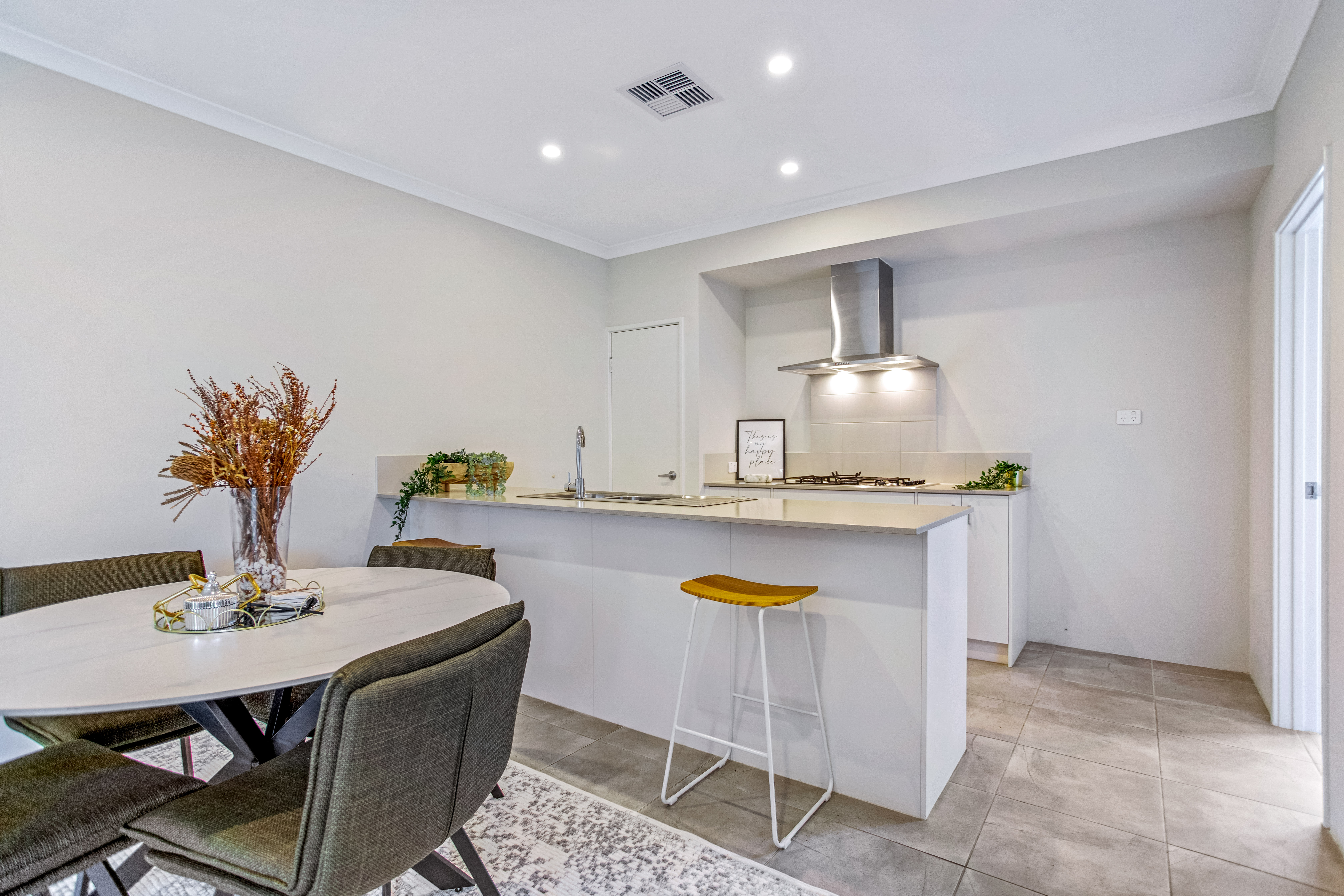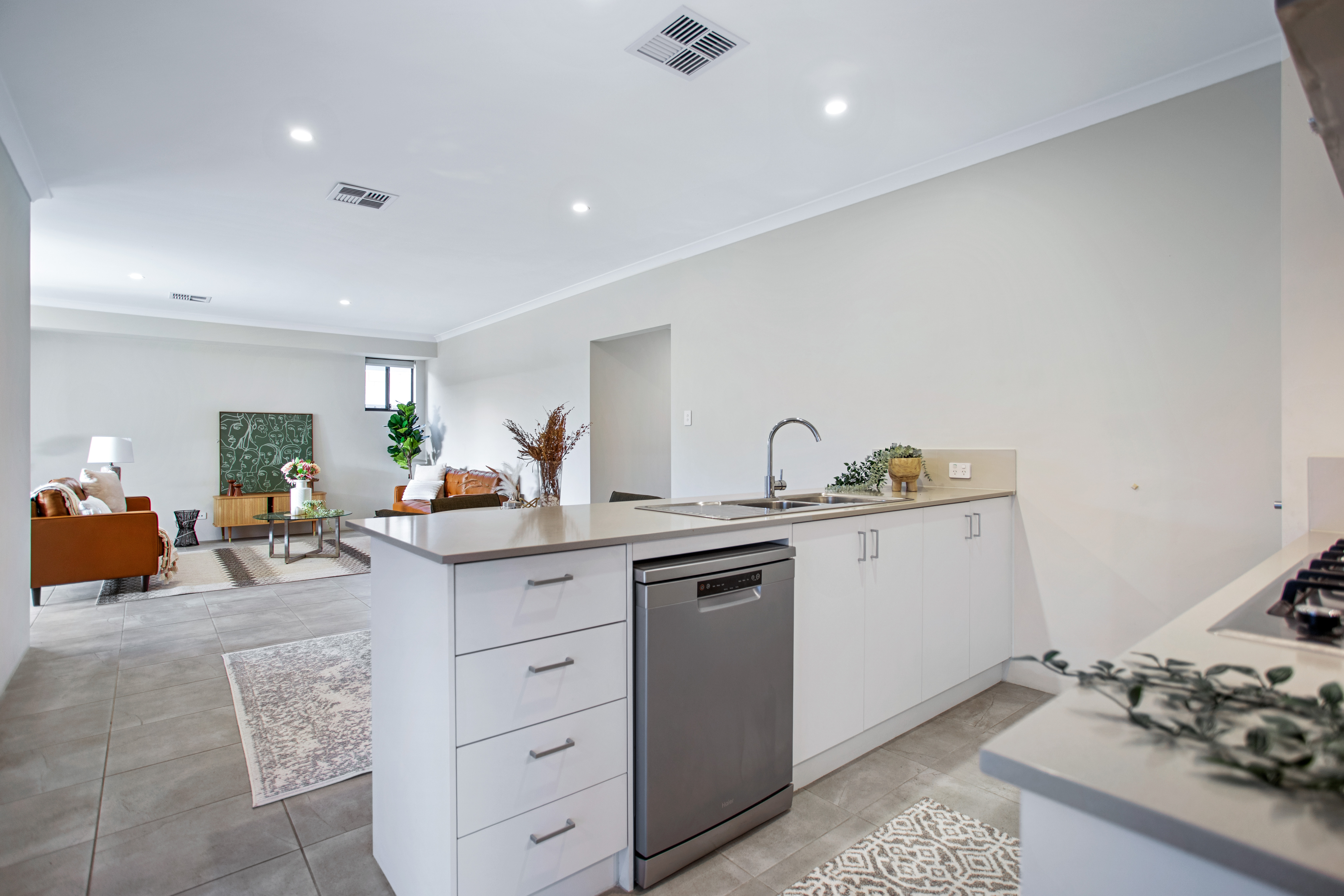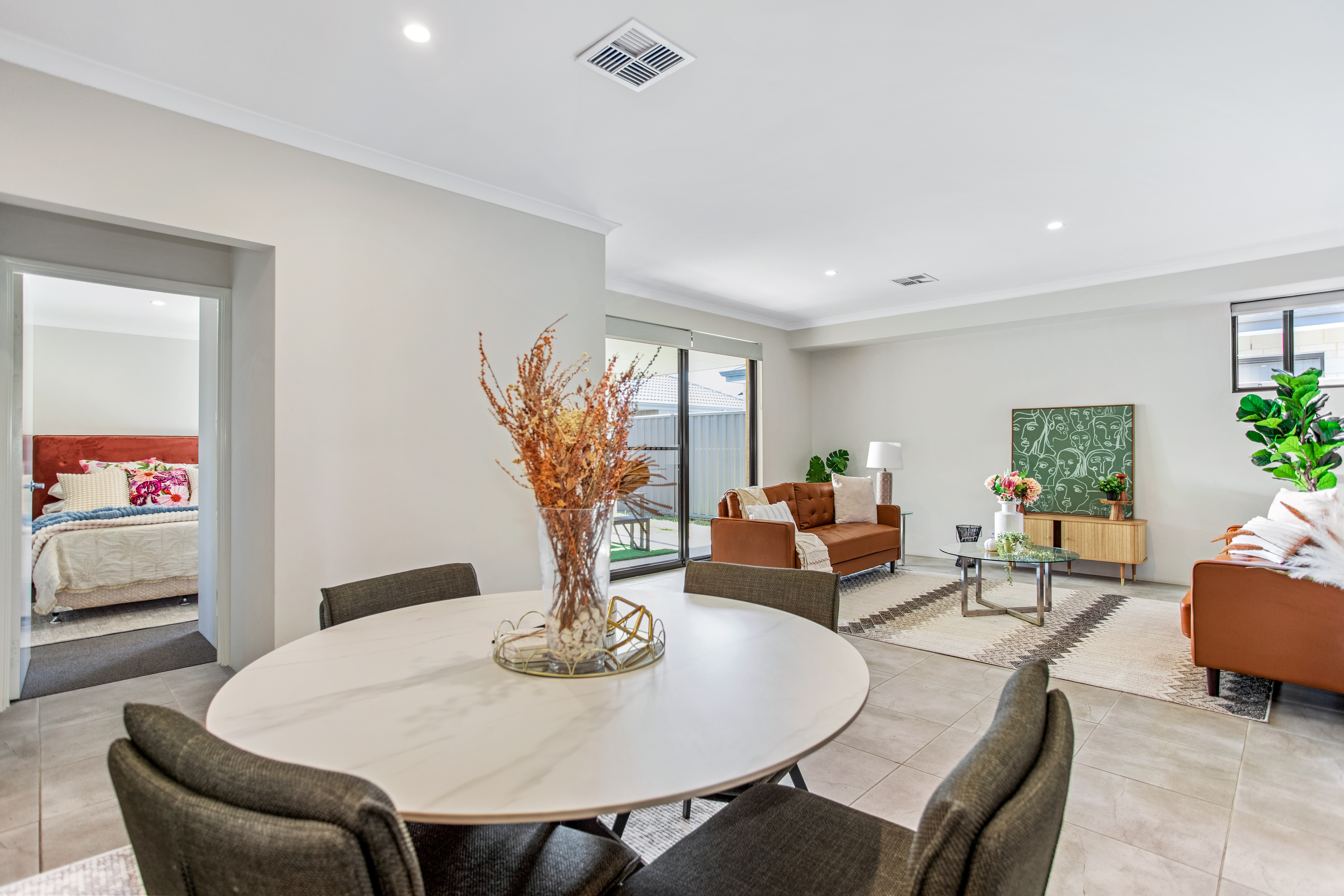 Theconceptdesigning styled this interior with a focus on balance, warmth, and functionality. The living space features rich tan leather sofas paired with a textured geometric rug and glass coffee table, striking a perfect balance between modern sophistication and comfort. Natural greenery, sculptural décor, and soft textiles elevate the aesthetic, bringing freshness and personality into the room. The open-plan kitchen and dining area continues the theme with clean lines and understated tones. A sleek breakfast bar with timber stools transitions seamlessly into the dining zone, where a round table and dark upholstered chairs encourage connection and conversation. Subtle decorative accents, such as vases with dried botanicals and styled greenery, infuse warmth without overwhelming the space. Together, these spaces embody modern family living — refined yet welcoming, stylish yet practical. The design highlights how thoughtful material selection, layered textures, and considered styling can transform everyday interiors into spaces that feel both timeless and full of character. Credits: concept & styling — Theconceptdesigning.